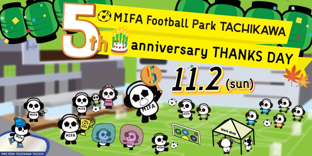日頃より施設をご利用いただいている会員様および地域住民の皆さまに感謝の意を込めて「MIFA Football Park 立川 5th anniversary THANKS DAY」を開催いたします。